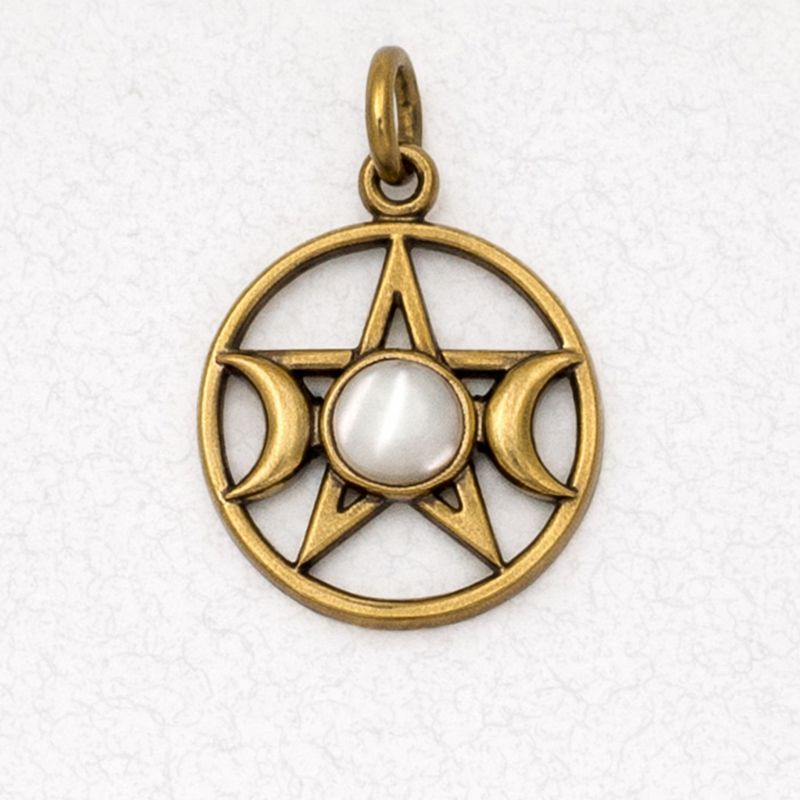 Wicca Bronze Triple Moon Pentacle with Mother of Pearl Inlay